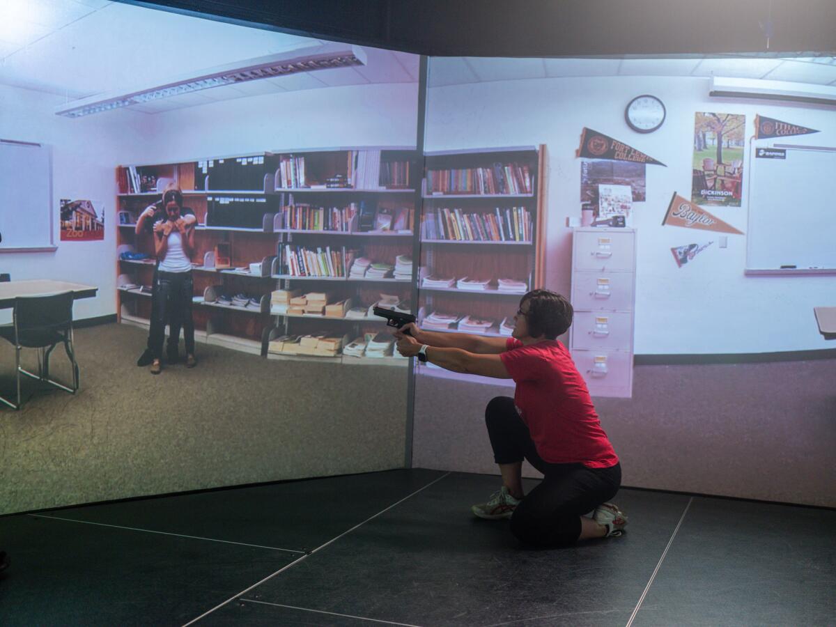 In Utah, we see teachers trained to shoot in six-week programs that also include tactical weapons familiarization, self-defense, emergency medical care, and certification to carry concealed weapons. In that state, teachers are legally allowed to bring firearms into classrooms without even notifying administrators or law enforcement, and the film shows them enrolling in and training inside high-intensity virtual simulations normally used in police academies. We hear one of these teachers speak about how her heart was beating 133 beats per minute inside of the simulator, and then watch her relive the scenario of rounding a corner and taking down a gunman in an instructional space where an instructor reminds her to take deep breaths and only focus on the threat at hand.