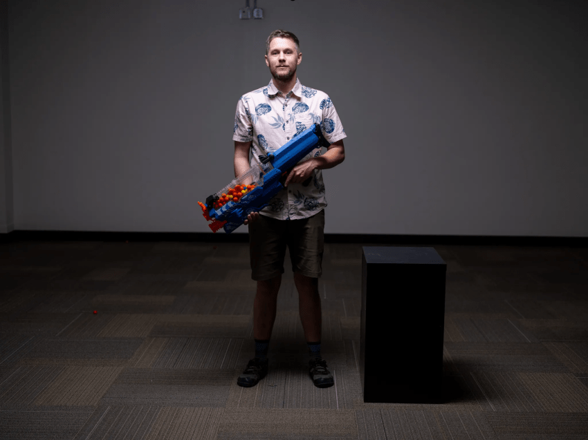 You watch the camera pan through a marketplace of commodities that appear ridiculous in their first blush. Flip-over bulletproof desks. Toy-sized “barky” robot dogs that howl for help and guard exits when triggered. Inflatable shields for first graders. Bulletproof backpacks. Ballistic window film. Classrooms retrofitted as reinforced shelters. Bulletproof whiteboards. Alarms. Locks. Framed “wall art” designed to stop rifle fire. One vendor sells a skateboard that also serves as a defensive shield. The seller tells us that “every time there’s a tragedy, it economically benefits my family” and predicts that by the time the film airs he’ll be a $300-million company. This is not parody. This is not fiction. It is all real. It all exists because a country has come to accept the idea that children will be murdered at school and that the answer, somehow, is more gear.